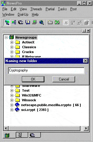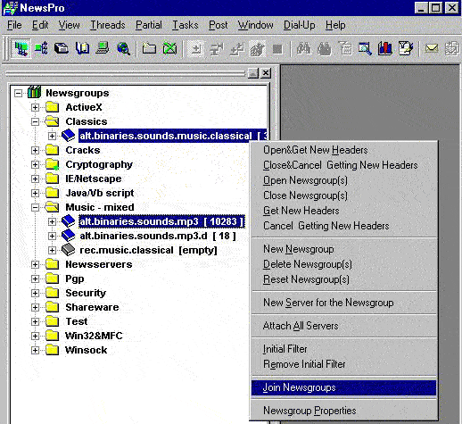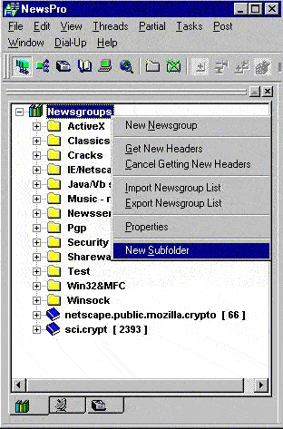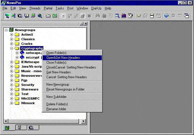 Folders behave alsmost as usual newsgroups - getting new headers, cancelling getting new headers, resetting, posting etc. To operate on a folder - use its context menu. Here we want to open a folder and get new headers: