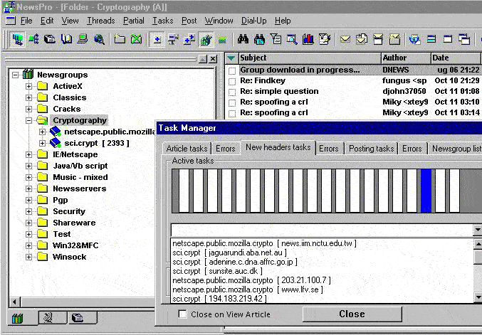 Now the folder window is open and all headers are directed to the folders window as well as to the newsgroups that constitute the folder as we can see in the task manager window. The lights on folder icons indicate what is going on like lights for newsgroup icons (green - getting new headers, red - error and done, dark-green - cancelling getting new headers):