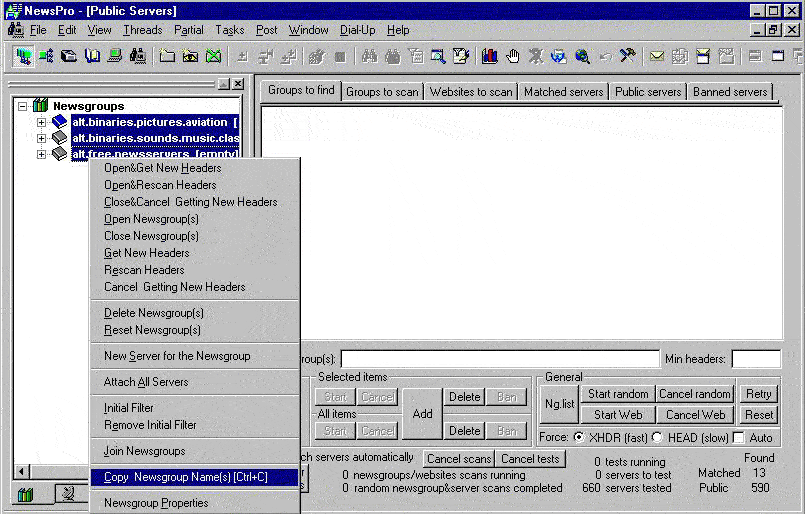 newsgroups or you can try all selected newsgroups on all servers without regard whether a newsgroup can