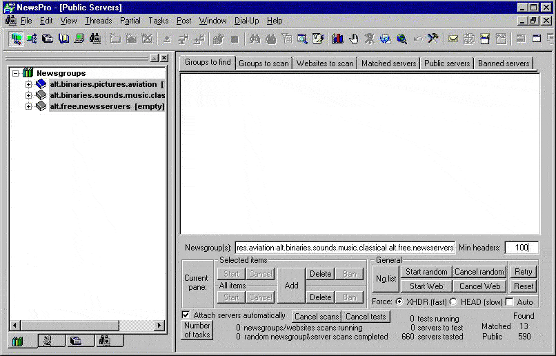 Then use any method, e.g. press 'start random'. In the 'matched' pane you'll see servers that matched a newsgroup