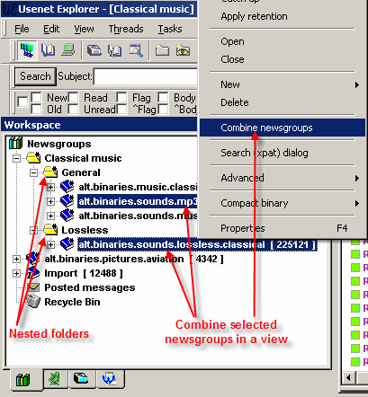 Folders can be nested as well as newsgroups can be joined in a view without creating a folder