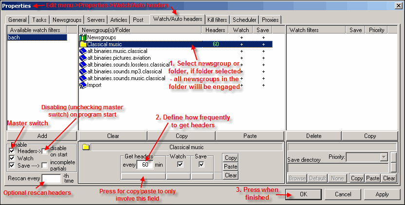 Below are shown get headers related settings in Edit menu->Properties->General. Quick retention normally should be checked, since otherwise the program in the first time will download all headers in the newsgroup to match the posting date.