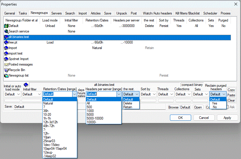 Newsgroup retention and headers per server