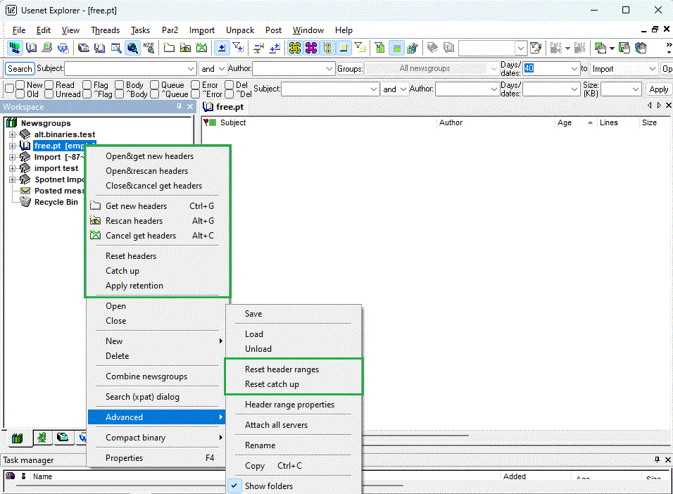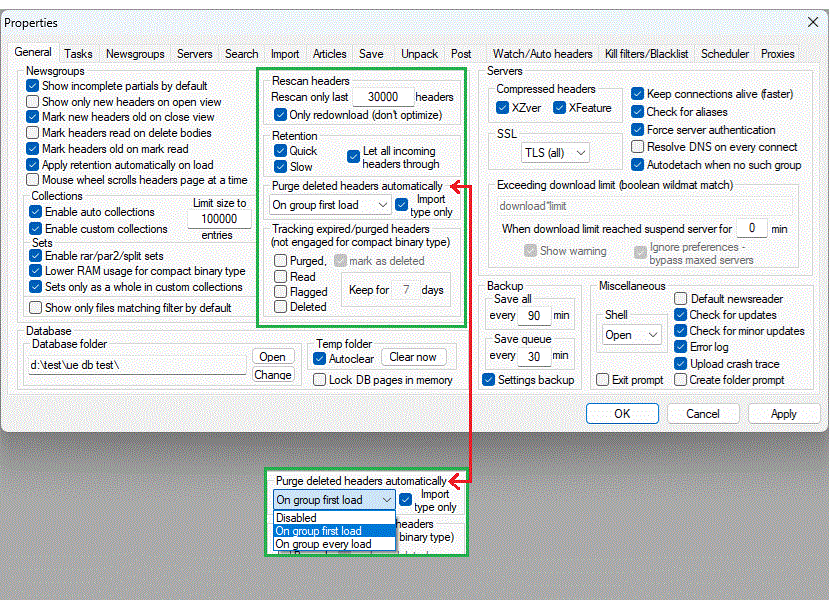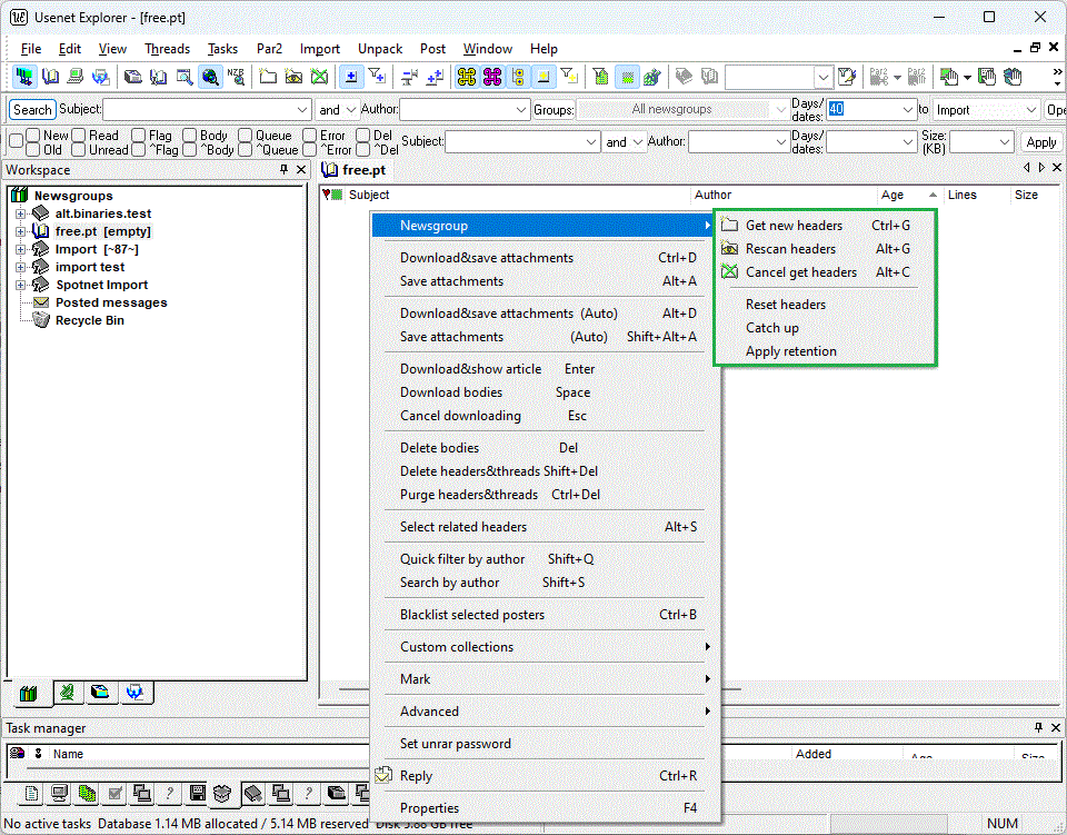 Below are shown get headers related settings in Edit menu->Workspace, Newsgroups, newsgroup context menu. It is possible e.g. to retain headers beyond user-defined retention (see Edit menu->Properties->Newsgroups) and apply retention manually from the context menu, all per newsgroup basis.