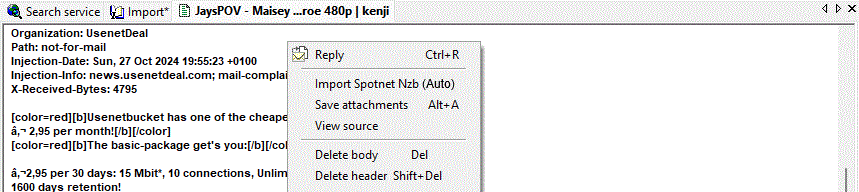or invoke "Download&show article" and then "Import spotnet nzb" or "Save Attachments" from the article view